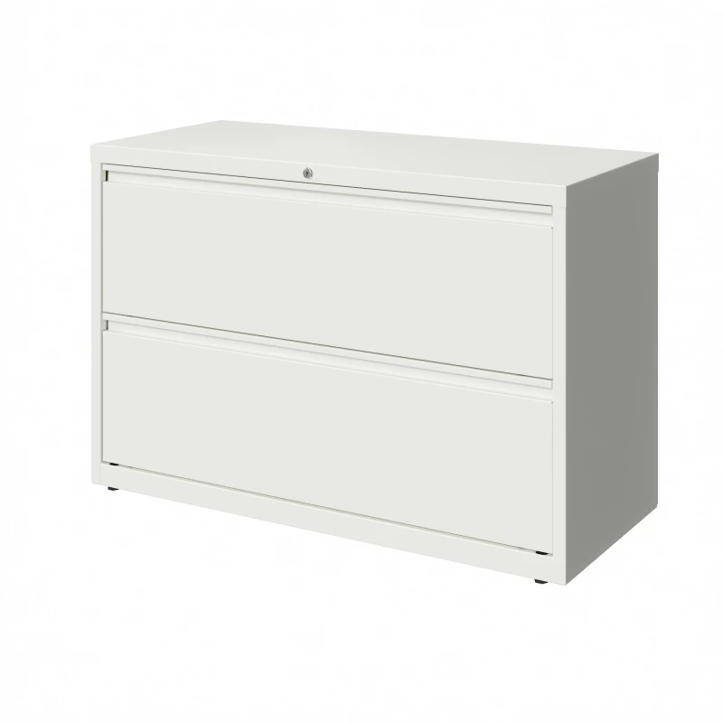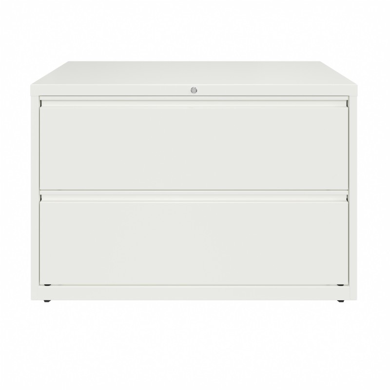 This 42 in. wide 2 drawer commercial grade lateral filing cabinet is designed for heavy duty use, yet looks great in any office. Precision ball-bearing suspension allows for quiet use in your busy office environment. Fully welded steel construction with reinforced base. Interlock system prevents tipping by only allowing one drawer open at a time. Dual lock bars and core-removable lock come standard. Unit includes hang rails, magnetic label holders, and four adjustable leveling glides. Greenguard Gold certified for indoor air quality. Meets or exceeds ANSI/BIFMA standards. TAA compliant. Limited Lifetime Warranty.