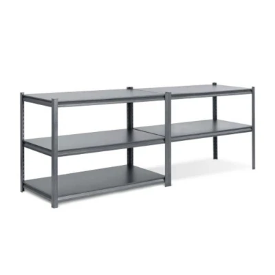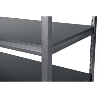 Each shelf on this heavy-duty storage rack can support up to 800 pounds for exceptional strength. The beams and frame are made of steel. This storage rack features a durable hammertone finish that will blend in well with most environments. Having a laminate surface, its shelving is also water-resistant and simple to clean.