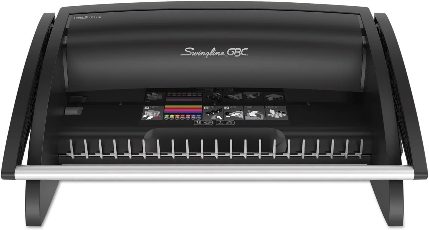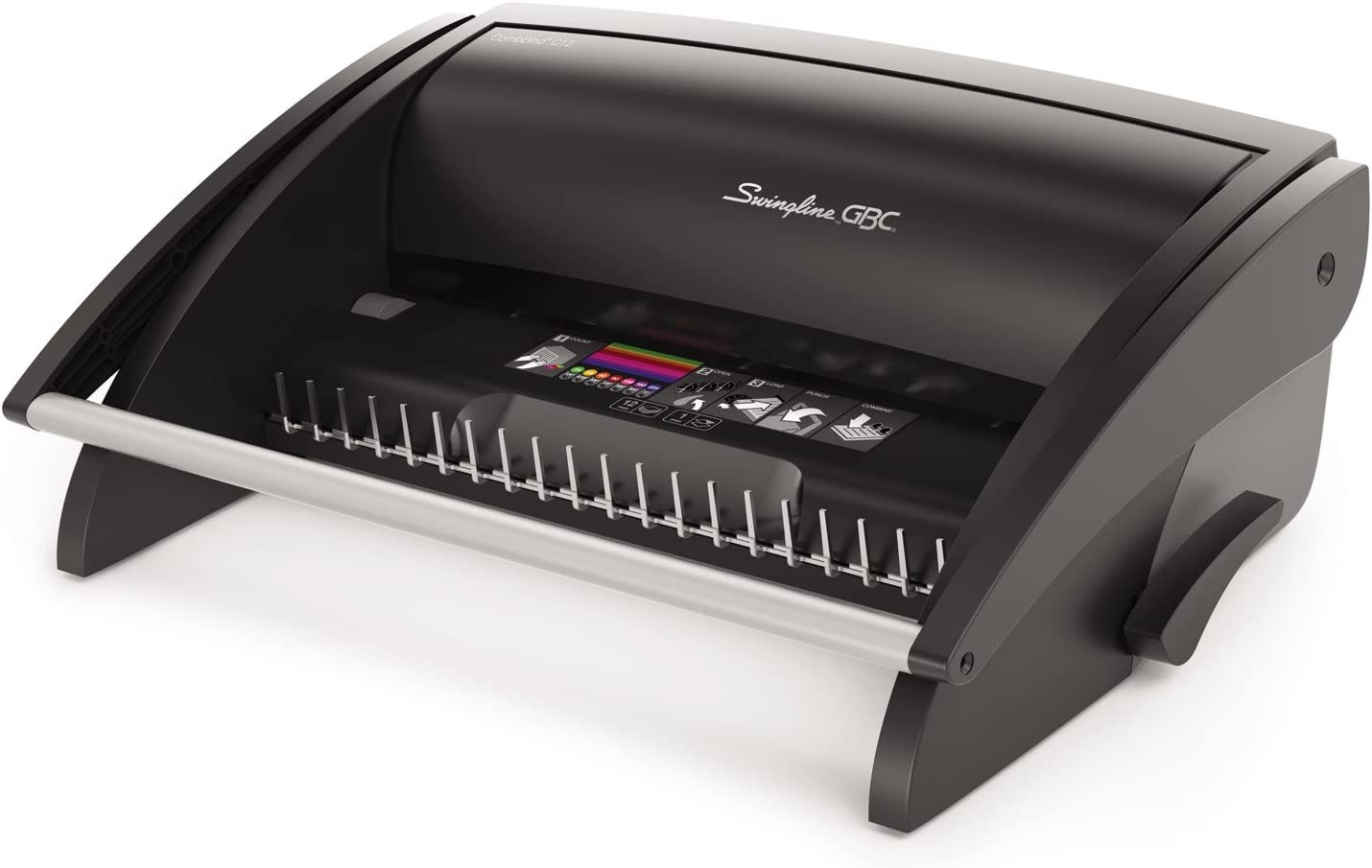 Swingline GBC CombBind C20 manual comb binding machine handles both punching and binding for moderate use environments. Binding machine offers a binding capacity of 330 sheets and a punch capacity of 28 sheets. Equipped with a low-force handle to simplify punching. Works with letter, oversize, and A4 documents. Has a maximum spine size of 1.5". Includes color coded document and spine size guides for precise handling. Attached tray collects waste for easy disposal.